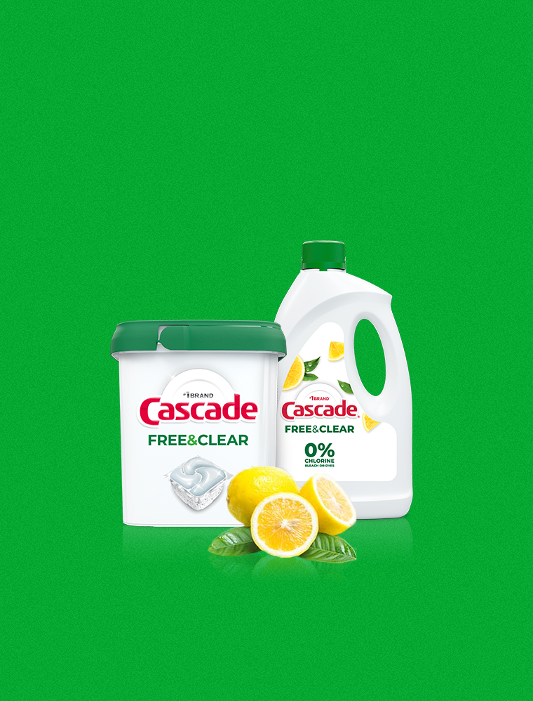 Everyone knows you can’t beat a Cascade clean, but did you know you can get a great Cascade clean without chlorine bleach, dyes or phosphates? That’s because Cascade Free & Clear is designed to power away 24-hour stuck-on food while delivering that signature Cascade clean your family wants. When we set out to make Free & Clear dishwasher detergent, we knew it had to contain only what was necessary, and be free from everything else. That’s why there’s no chlorine bleach, no dyes* and absolutely no phosphates. Just a light citrus scent. So, go ahead and clean your dishes with confidence and take Cascade Free & Clear for a spin – in your dishwasher.