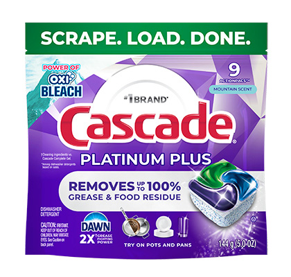 New and Improved Cascade Platinum Plus ActionPacs dishwasher detergent gives your dishes a breakthrough clean with up to 100% food residue removal. Loaded with 2X* the Dawn grease fighting power, and 2X* the tough food scrubbers, it has soaking, scrubbing, and rinsing built right in.